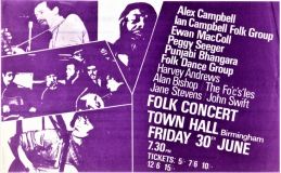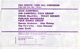 On June 10th 1967 the Birmingham & Midland Folk Centre organised a concert of Indian Music by Ravi Shankar at Digbeth Civic Hall. A poster for the event can be seen below, also the cover and an inside page of the programme, the inside page is particularly interesting as it shows a list of the major folk clubs running in Birmingham at the time. Later that month on 30th June at the Town Hall there was a concert organised for "Freedom in Vietnam", both a poster and leaflet for the event have been reproduced below.