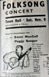 On Saturday November 9th, a concert was held at Birmingham Town Hall called " Songs For Remembrance Day". It was put on as a joint promotion by CND and the Folksong Promotion Agency and had Ewan McColl and Peggy Seeger as headliners. The poster for this concert, which came from the scrapbook of the late Eileen Whiting, can be viewed below.