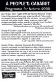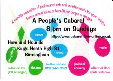 The Traditional Arts Team was formed in March 1999, and initially comprised of Pam Bishop, Graham Langley, Katrice Horsley and Ian Ellis. They ran workshops on folksong, music, dancing and storytelling, and some of their projects have become independent entities (e.g. Moseley Village Band & Birmingham Storytelling Cafe) . One of their first Projects was "A People's Cabaret", which was a monthly series of concerts and performances held at the Hare & Hounds in Kings Heath from March 1999 until June 2002. One of their advertising cards can be seen below and the full 3 year programme can be found at:-