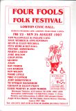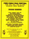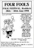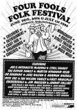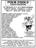 The Four Fools Folk Festival was started by Angie & Ken Bladen, together with Bob & Ali Matthews. The first festival was in June 1989 and the foursome ran the festivals together until 1991. Ken and Angie continued running the festivals in Redditch until 1995, when they moved to Chorley in Lancashire, relocating the festival to Lowton Civic Hall, and later on to St Michaels School in Chorley.. In total they ran 23 festivals finally retiring in 2011 on their move to Saltburn. Some of the posters for the festivals can be seen below.