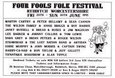 The original Four Fools Festival in Redditch continued in Redditch, but under the name The Redditch Folk Festival (see Redditch Folk Festival article)