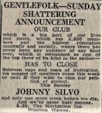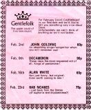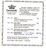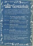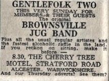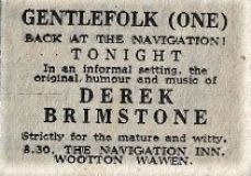 Gentlefolk came into being in the early 70's, and originally ran at the Navigation Inn, Stratford Road, Wooton Wawen initially on Sunday evenings, . Following licensing issues at the Navigation, it had to close temporarily, but once the issues were sorted out they re-opened at the Navigation on Thursday evenings again as Gentlefolk One About the same time Gentlefolk Two came into being on a Sunday night at the Cherry Trees Motel, Stratford Road, Alcester. It finally closed in 1979, having booked some of the biggest names on the folk circuit, including Decameron, Barbara Dickson, Jasper Carrott and Chris Rohmann.