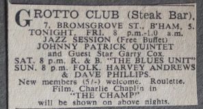 This was a club which ran different musical genres, including Folk, R & B, and Jazz. According to the advert (below), it was also a gambling venue and ran films for members.