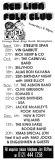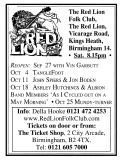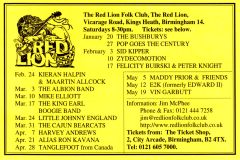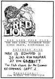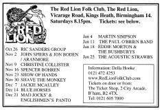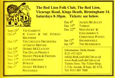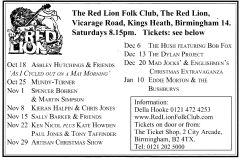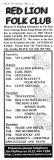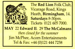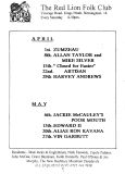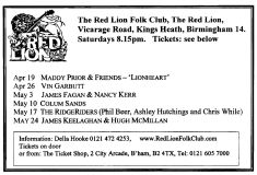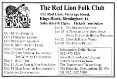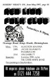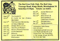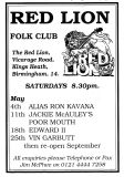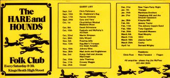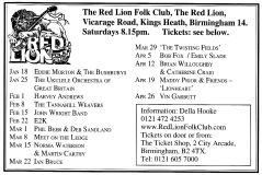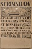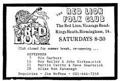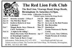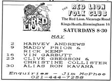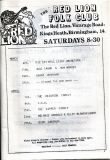 Jim McPhee started Scrimshaw Folk Club in the late 60's at St Dunstans Centre, Kingsfield Road, Kings Heath , adverts have been found showing that Scrimshaw was running on Thursday night's,as early as 1969 up to September 1976 in the Broadside magazine, Jim's granddaughter has recently found a Scrimshaw poster in her late dad's things (see below). Around this time the club moved premises to the Hare and Hounds, High Street, Kings Heath until late 1982 or early 1983, when it moved to the Red Lion, Vicarage Road. Jim McPhee also ran Acorn Agency, representing folk club artists, including a number of top folk artists. Jim retired from the club in May 2001, when Della & Chris Hook took over the reins, with the club still running on a Saturday night. In 2006 the club won BBC Radio 2's "Folk Club of the Year Award and in September 2010, the club changed the night they ran to a Wednesday. The club is still running successfully at the Red Lion.