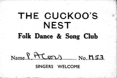 Graham & Sue, formed the Cuckoos Nest Folk Dance & Song Club in the late 1960's, it was unusual in that it combined both singing and dancing on the same night, with dances interspersing the songs. Graham thinks that their first guests were the Young Tradition, and that the Yetties also appeared there. Before moving to Cyprus around 2007, they also sucessfully ran Ceilidhs under the name of "Bop Till You Drop" in a number of venues around Birmingham. A membership card for the club can be seen below.