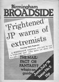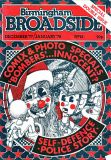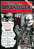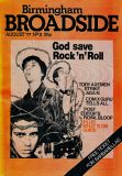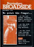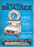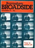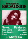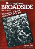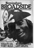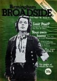Broadside magazine was the creation of Trevor Fisher and Brian Homer, who produced its precursor, Grapevine Magazine. It was an amalgamation of two magazines, Grass Roots and Grapevine and was run out of offices in Lozells Road , Birmingham and followed a similar format to the Grapevine in running articles the local press wouldn't print, plus a gig guide, contact lists for a wide variety of societies, and a whats on section. Broadside ran until 1978/1979, when it eventually ceased publication. Brian & Trevor went on to produce several more publications, including "Movement of Jah People", "Talking Blues" and eventually set up "Ten 8" with an Arts Council grant.